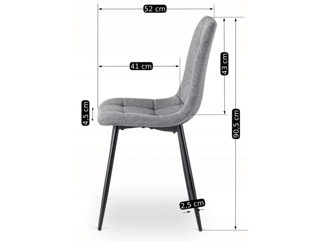 Stolička má šírku sedadla 43 cm, hĺbku sedadla 41 cm a výšku sedadla 51 cm, čo poskytuje dostatočný priestor pre pohodlné sedenie. Kbelíkový dizajn sedačky podporuje správne držanie tela a operadlo vysoké 43 cm spolu s ergonomickou šírkou 42 cm zabezpečuje oporu pre chrbát. Sedadlo s hrúbkou 4,5 cm ponúka optimálnu mäkkosť a komfort.